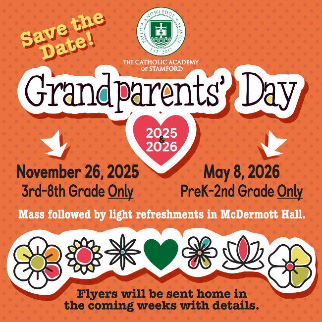 Save the Date! November 26, 2025 for Grades 3-8 and May 8, 2026 for Grades PreK – 2nd. CAS will celebrate Grandparents Day with a special Mass and reception on these dates. Grandparents Day is an annual celebration filled with singing, laughter and excitement as our students welcome their grandparents to our campus. For more information, please contact pvg@catholicacademystamford.org.